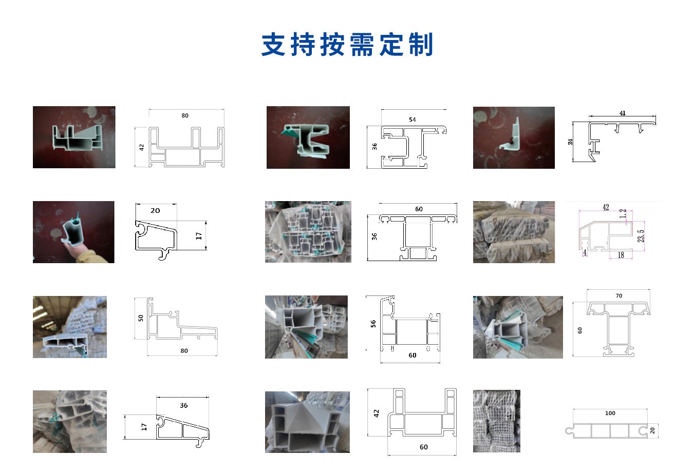PVC異型材模具:PVC塑鋼門窗、平開門窗、推拉門窗、護欄、線槽等。